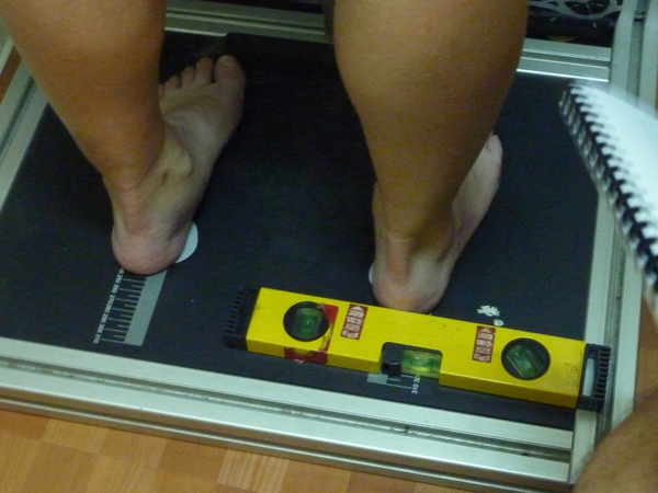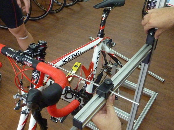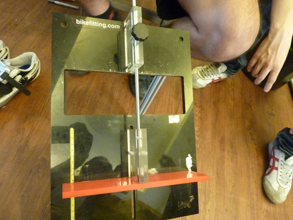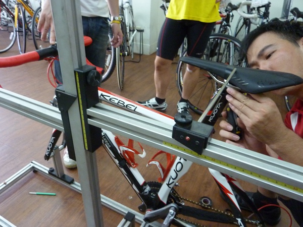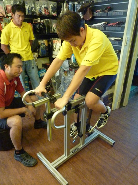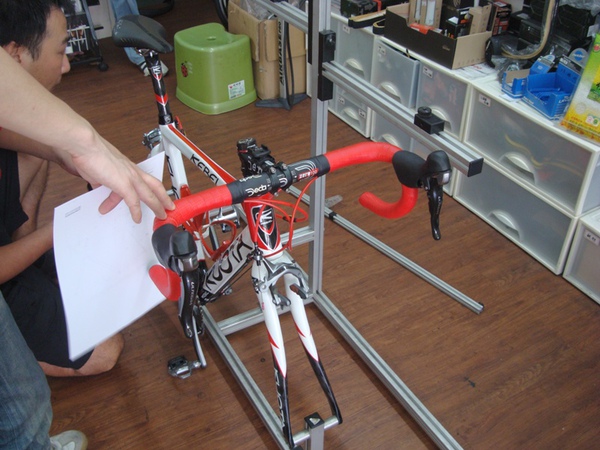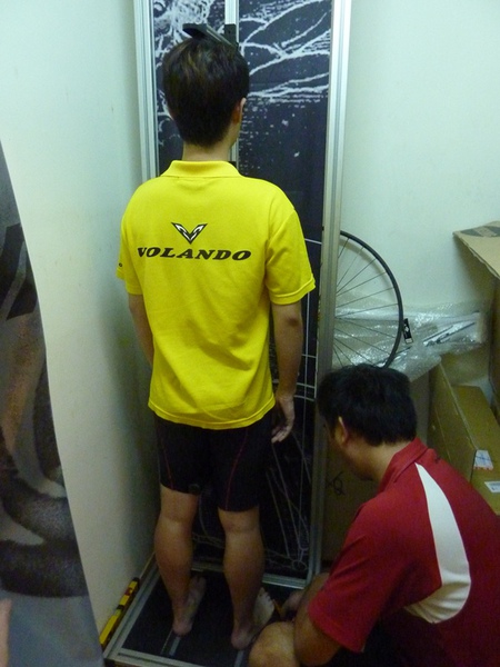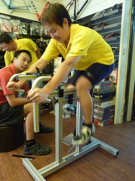 將各項數據輸入電腦後,卡鞋調整好~ 把算出來的數據先用模擬車架實際模擬一次,然後再上車實際先睬個幾分鍾