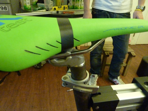 再來找坐墊中心位置,用的是跟我原本一樣的FIZIK ARIONE,中心位置在坐弓上的科度上取中間值即可!